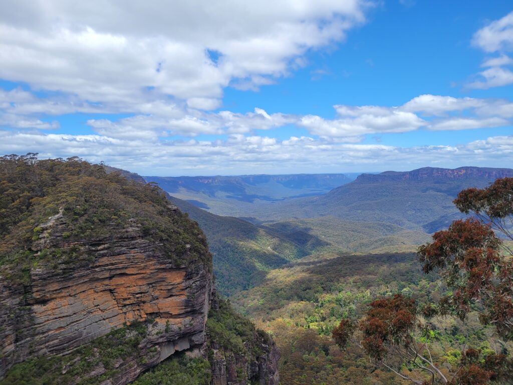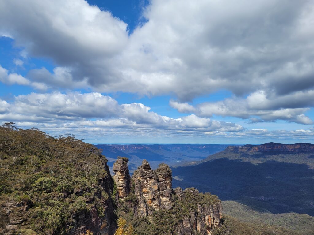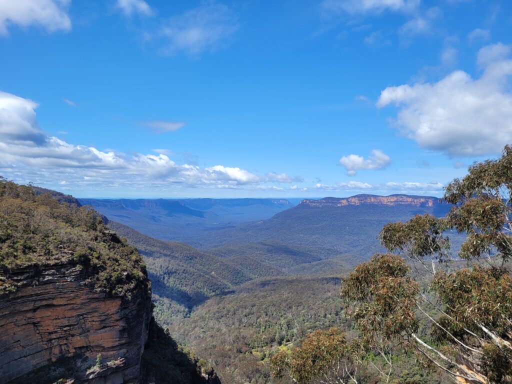 Vroeg in de ochtend, rond half acht, waren twee Duitse studenten en ik op het perron met koffie in de hand wakker aan het worden terwijl we wachtten op de trein. Met twee uur waren we aangekomen in Katoomba, een klein stadje gelegen in de Blue Mountains. Na eten en drinken te hebben gekocht, vertrokken we naar de wandelroutes voor die dag. Het waren vrij pittige routes, waaronder een afdaling van 801 treden, die vrij glad was. Gelukkig was het nauwelijks druk en hadden we vaker wel dan niet het tropische woud voor onszelf. De routes hadden meerdere uitzichtpunten die werden bezocht en vergezeld met veel ge-‘wow’, en uiteraard namen we tal van foto’s. Ondanks het cliché, doen de foto’s en het filmpje geen eer aan het uitzicht.