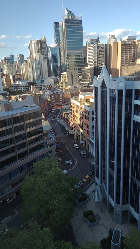 Ook vanuit mijn nieuwe huis in Roseberry slaagde ik er niet in om een appartement te vinden. Ik besloot daarom maar naar een commerciële accommodatie te gaan en woon nu in Haymarket, een leuke wijk vlak naast het centraal station en het zakendistrict. Daar woon ik op de 13e verdieping met een leuk uitzicht op de grote kantoren en gebouwen.