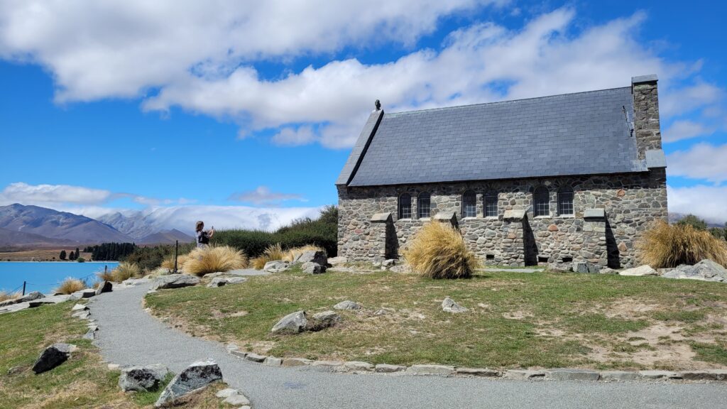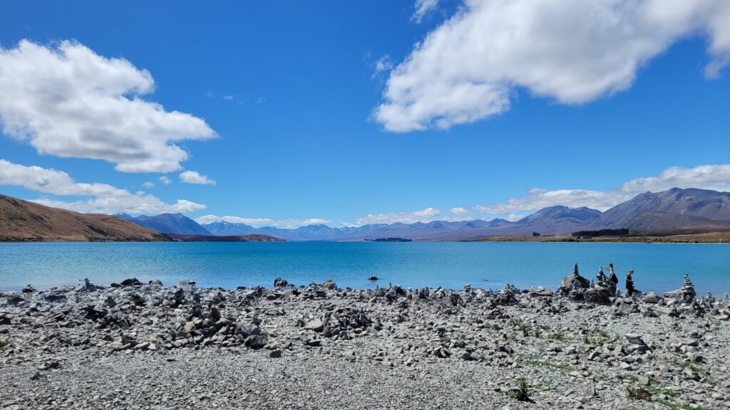 Eerst reed ik nog wel even door naar Lake Tekapo waar ik het eerste indrukwekkende turquoise meer aanschouwde. Hier stond de enigszins bekende Church of the Good Shepherd prachtig voor het meer. Ook bofte ik qua weer gezien het tussen de 25 en 30 graden was en de zon sterk was. Onderweg terug naar Kimbell, voordat ik mezelf ging inchecken, stopte ik bij een pie shop. Hoewel de cuisine in Nieuw-Zeeland niet bijzonder is, staat het wel bekend om pies. Daarna kwam ik aan bij de Airbnb die landelijk was gelegen tussen de vele schapen. Het uitzicht over de heuvels was mooi, zeker wanneer ’s ochtends de zon opkwam en achter de heuvels waren de besneeuwde bergen te zien. Het uitzicht van Nieuw-Zeeland wende echter erg snel, maar het was overal prachtig.