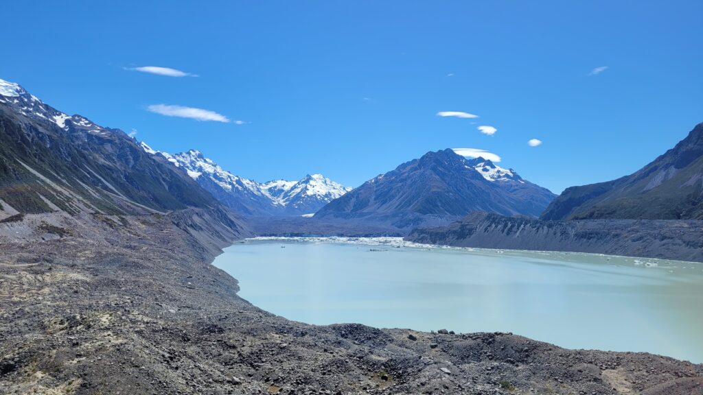 De dag erop, op zondag, vertrok ik naar Mount Cook. De omgeving van Mount Cook was ongeveer anderhalf uur rijden door de bergen en langs een ander mooi, blauw meer. Ik heb daar een hike gedaan richting de Tasman Glacier. Hoewel de uitzichten er indrukwekkend waren, vond ik de gletsjer matig want er was vrij weinig van over: hij was grotendeels gesmolten. Zojuist heb ik opgezocht of dit klopt en dit is onjuist: het is de langste gletsjer van Nieuw-Zeeland met 29 km. Echter, de Tasman Glacier is deels gesmolten en er is een meer in de morene sinds enkele decennia. Daarom leek de gletsjer niet zo indrukwekkend als dat deze kennelijk is.